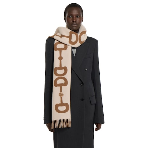 Los accesorios suaves y de seda de la colección Pre-Fall 2025 presentan los códigos de la Firma en sofisticados adornos, parches con logotipos y sutiles bordados. Esta bufanda de cashmere de lana exhibe una intarsia de Horsebit y un ribete de flecos.