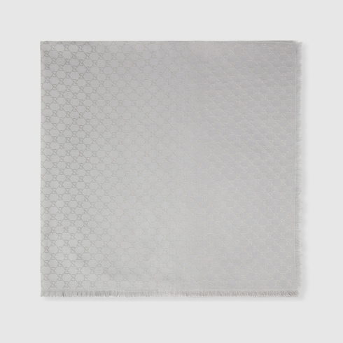 El exclusivo motivo GG vuelve para la colección Otoño Invierno 2025 en tonos suaves. Este chal se ha confeccionado en jacquard de lamé de seda, lana, algodón y viscosa con GG.