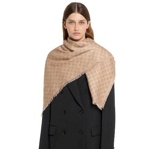 El exclusivo motivo GG vuelve para la colección Otoño Invierno 2025 en tonos suaves. Este chal se ha confeccionado en jacquard de lamé de seda, lana, algodón y viscosa con GG.