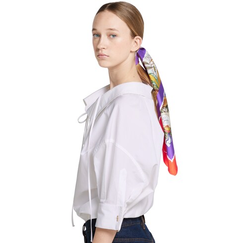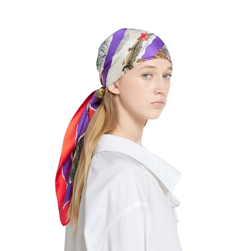 Este pañuelo cuadrado se realza con una obra del ilustrador Gio Pastori, conocido por su técnica de papel que crea composiciones visualmente impactantes. Como parte del proyecto 90 x 90, el diseño versiona un motivo Gucci inspirado en la naturaleza.
