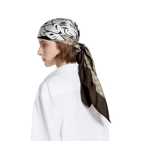 Este pañuelo cuadrado exhibe una obra del artista multidisciplinar E.S. Glenn (Everett Glenn), en cuyo trabajo combina cómics, pintura y actuación para crear narrativas profundamente personales. Como parte, el diseño versiona el motivo GG de Gucci.