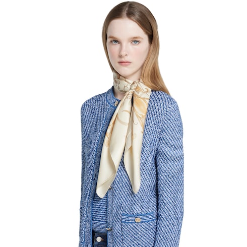 El tradicional estampado Flora se reinterpreta en la colección Cruise 2025. Este inconfundible patrón confiere una nota romántica a una selección de accesorios suaves y de seda en tonos pastel. Este pañuelo cuadrado se ha fabricado en seda marfil con el estampado Gucci Flora, que aporta un toque romántico a cualquier look.