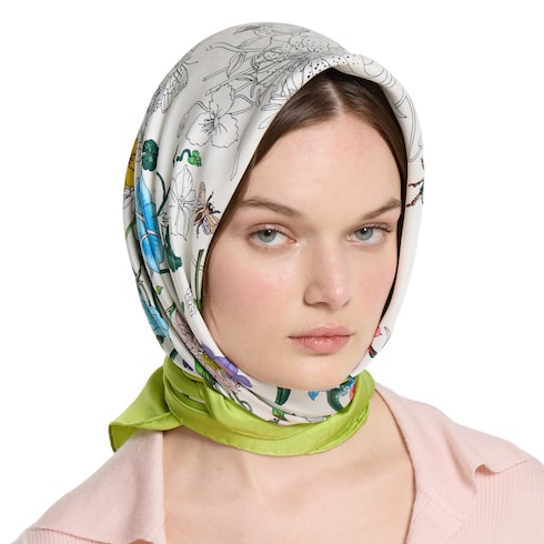Los accesorios suaves de la colección Pre-Fall 2025 presentan los códigos de la Firma con sofisticados adornos, parches con logotipos y sutiles bordados. Este pañuelo cuadrado de sarga de seda actualiza el motivo Flora de Gucci en nuevos colores.