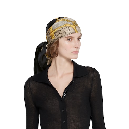 Los motivos tradicionales de la Firma destacan en estampados innovadores y llamativos. Este pañuelo de seda exhibe un estampado con GG, Horsebit, estribos y cadenas que enfatiza la inspiración de los diseños de Gucci en el mundo ecuestre. El adorno negro completa el elegante diseño.