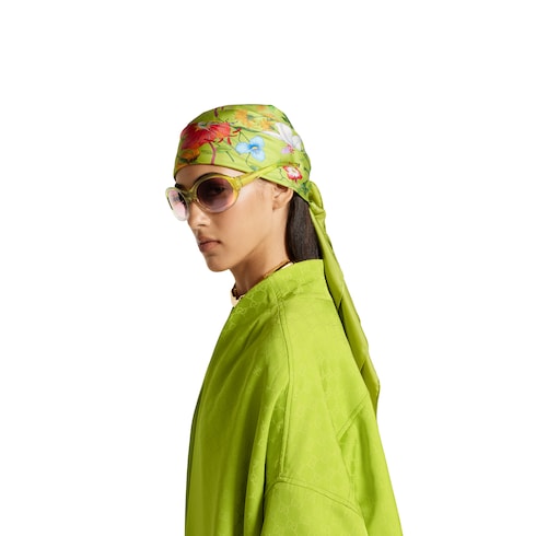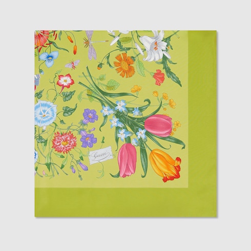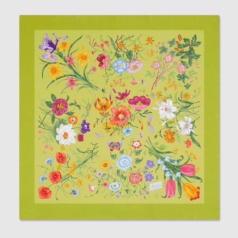 Entre los llamativos accesorios de seda de la colección Primavera Verano 2025 se incluye este pañuelo cuadrado con el motivo Gucci Flora.