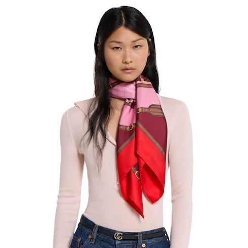 En la colección Otoño Invierno 2025, la Firma rinde homenaje a sus orígenes con diseños como este pañuelo cuadrado de seda con un estampado integral Gucci de cinturones y Horsebit.