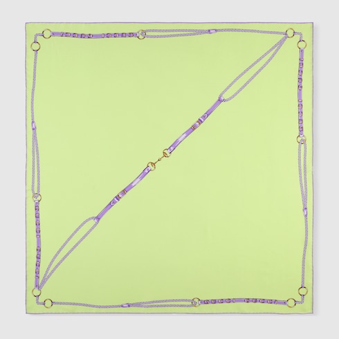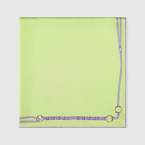 En la colección Otoño Invierno 2025, la Firma rinde homenaje a su extenso legado ecuestre con diseños como este pañuelo cuadrado de seda con un estampado integral Gucci de cinturones y Horsebit.
