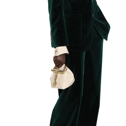 En la colección Otoño Invierno 2025, este bolso de fiesta cuenta con el emblemático detalle de medio Horsebit y se realza con los apliques de inspiración ecuestre de la Firma. El modelo en charol con detalles en tonos dorados combina un estilo atemporal con una silueta actual.