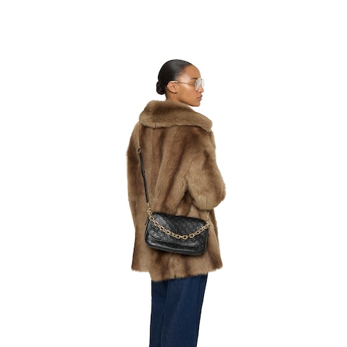 En la colección Otoño Invierno 2025, la nueva colección GG Emblem reinterpreta la historia de la Firma, marcada por la elegancia y la artesanía. Este diseño incluye una correa de cadena para el hombro y una correa ajustable de piel.