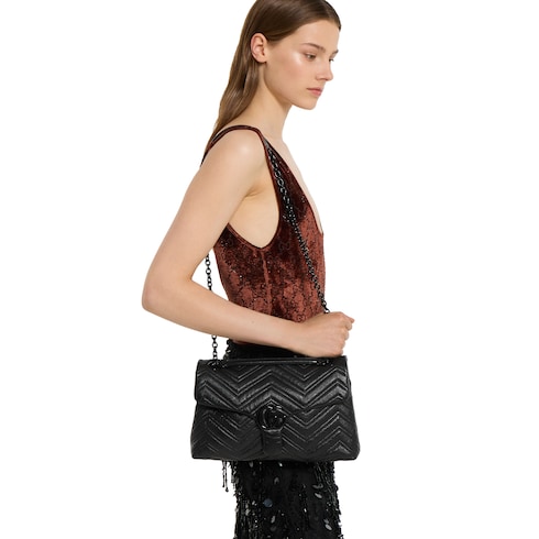 En la colección Otoño Invierno 2025, la exclusiva línea GG Marmont de la Firma cuenta con el emblemático logotipo de Doble G, una correa de cadena facetada y una silueta suave y estructurada. Este modelo está confeccionado en piel matelassé con motivo chevron suave y ligera, y cuenta con un aplique y una cadena esmaltados del mismo tono.