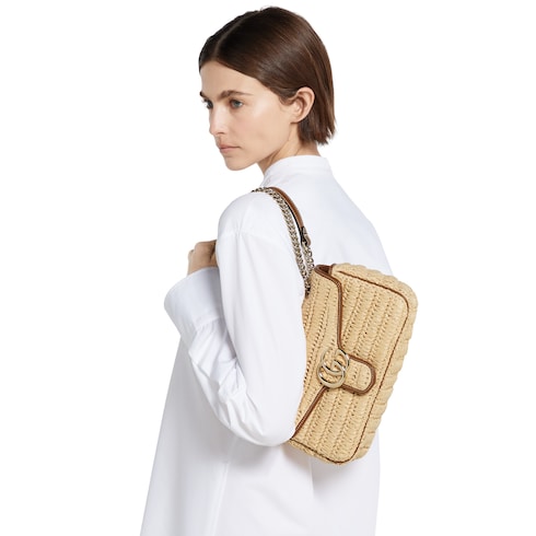 El bolso de hombro GG Marmont mediano, tejido en viscosa efecto rafia, se caracteriza por una textura natural ideal para el buen tiempo. El ribete de piel suave y el aplique de Doble G completan un diseño que combina inspiración para la temporada con detalles atemporales de la Firma.
