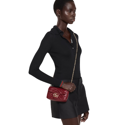 Este minibolso GG Marmont se ha fabricado en exclusiva piel matelassé rojo Gucci Rosso Ancora con motivo chevron. El modelo se realza con el emblemático aplique de Doble G de la línea, un símbolo clásico de los años 70 que se ha convertido en el sello distintivo de la Firma.