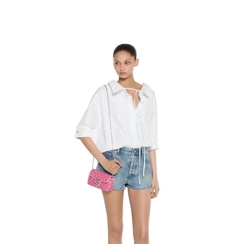 La exclusiva línea GG Marmont de la Firma cuenta con el aplique de Doble G, una correa de cadena facetada y una confección flexible con materiales sofisticados. Este diseño se ha fabricado en rizo con GG en un color en tendencia para la temporada.