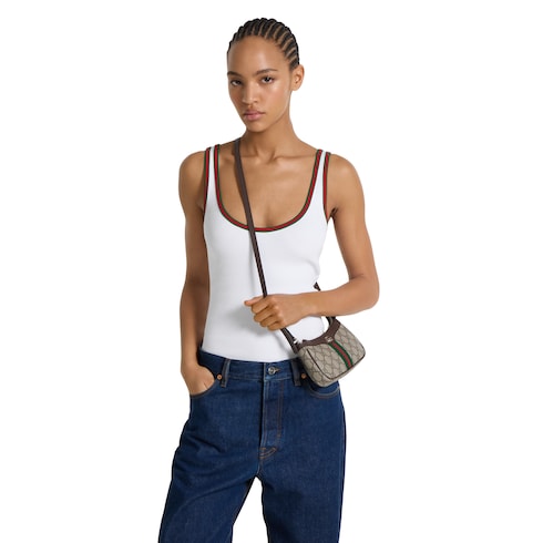 La colección Ophidia evoca el legado de la Firma con la exclusiva tribanda Web y el emblema de Doble G con un acabado dorado claro. Los diseños se han fabricado en tejido revestido con el monograma GG y un forro interior de algodón verde.
