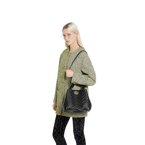 Gucci Betty añade un toque de espontaneidad al diseño refinado, transformándose fácilmente de un bolso tipo tote estructurado a una silueta tipo bucket de líneas suaves. El estilo se completa con asas superiores y una correa de hombro con cadena, ofreciendo múltiples opciones para combinar con elegancia y versatilidad.