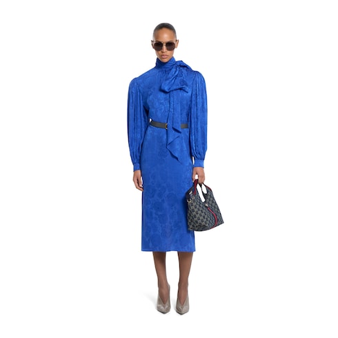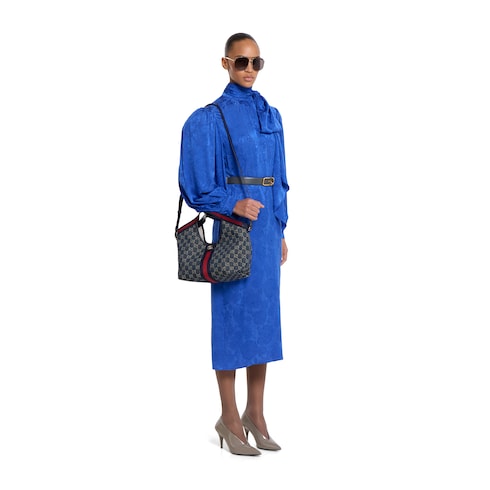 Se presenta la versión pequeña del Gucci Giglio, revelada por primera vez en el desfile Cruise 2026 en Florencia, aquí en un tamaño versátil. La línea rinde homenaje a las raíces italianas de la Firma y al espíritu de continuidad y reinvención. Este bolso amplio se ha fabricado en denim con GG y un ribete de tribanda Web y un neceser extraíble.