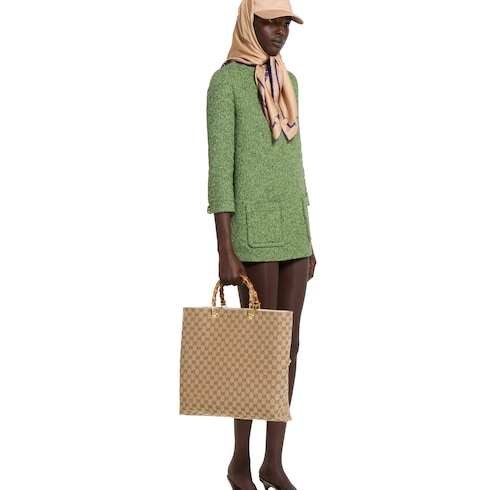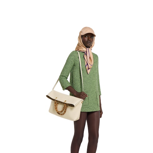 En la colección Otoño Invierno 2025, este bolso tote grande y reversible cuenta con piel de charol por un lado y lona GG exclusiva por el otro. Su suave silueta se realza con asas de bambú, mientras que el neceser extraíble aporta versatilidad al espacioso interior. El modelo se remata con apliques dorados y una correa ajustable para el hombro.