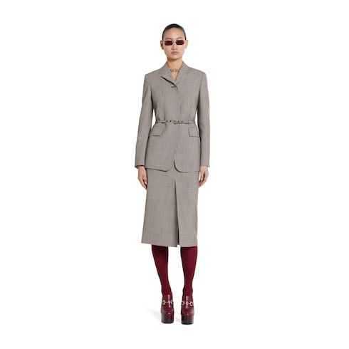 Los abrigos, las chaquetas y los vestidos de la colección Pre-Fall 2025 combinan una elegancia sutil con detalles refinados. Esta chaqueta de botonadura sencilla con cinturón extraíble presenta un diseño sofisticado de lana gingham con un botón de Doble G forrado del mismo género.