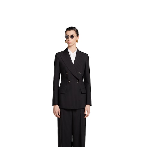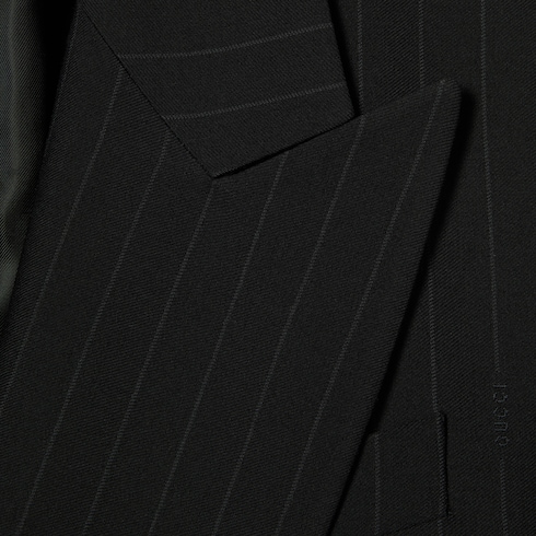 Los diseños de sastrería realzan la artesanía exquisita y los materiales sofisticados que definen las últimas prendas ready-to-wear de Gucci. Esta clásica chaqueta de doble botonadura de Pre-Fall 2025 se ha confeccionado con un exclusivo jacquard de lana con raya diplomática Gucci.