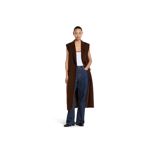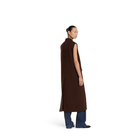 La colección Pre-Fall 2025 introduce una nueva versión de los materiales cálidos en prendas de abrigo sofisticadas, con siluetas tradicionales y contemporáneas. Este chaleco largo de lana y seda exhibe un motivo GG marrón y rosa claro en el interior.