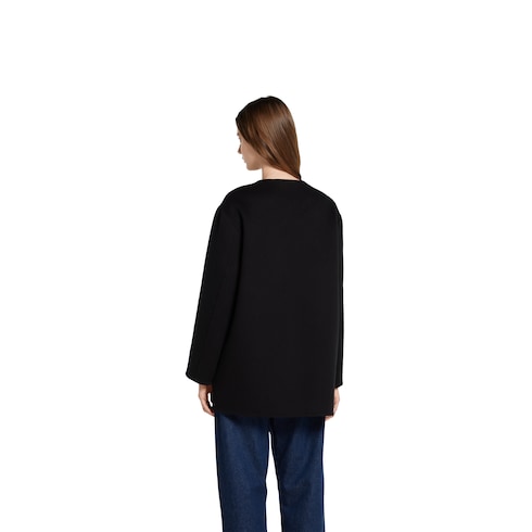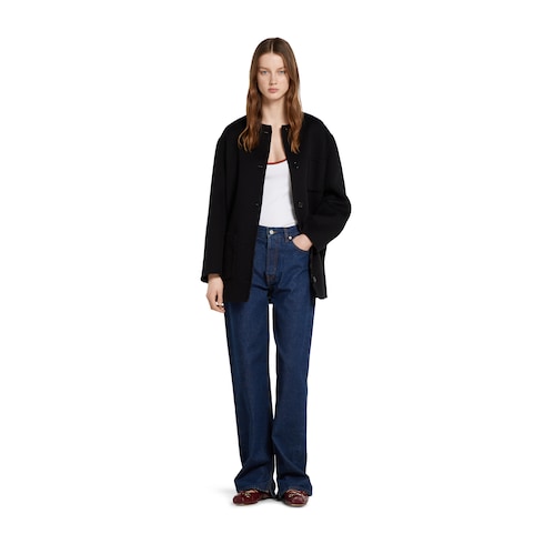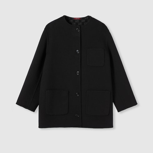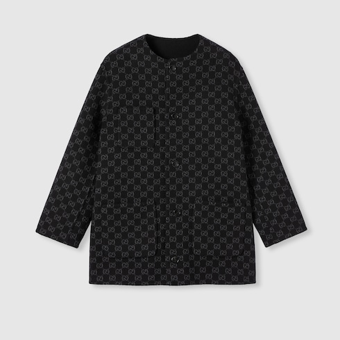 La colección Pre-Fall 2025 introduce una nueva versión de los materiales cálidos en prendas de abrigo sofisticadas, con siluetas tradicionales y contemporáneas. Esta chaqueta reversible se ha confeccionado en una mezcla de lana y seda lisa por un lado y gris con el motivo GG por el otro.