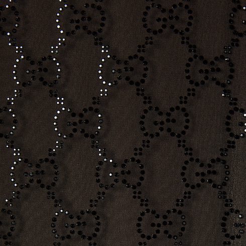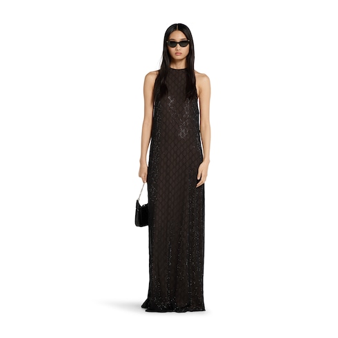 Las elegantes prendas con materiales refinados en tonos claros y profundos destacan con siluetas sensuales para elevar la colección Pre-Fall 2025. Este vestido largo de seda ligera destaca por un llamativo bordado GG de cristales.