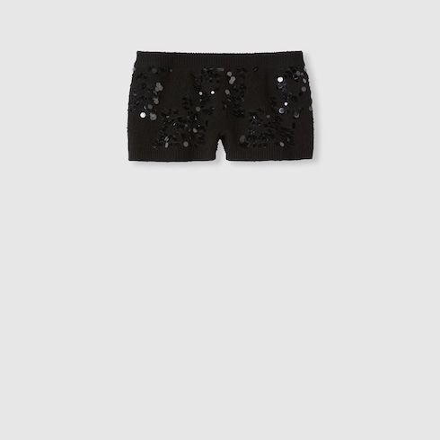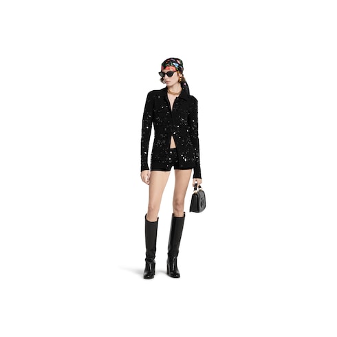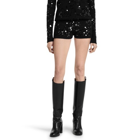 El hilo sofisticado aporta volumen a nuevos diseños de punto y destaca aún más gracias a los detalles artesanales que resaltan las ricas texturas. Los hilos cobran una importancia renovada en estas prendas de punto, que pueden llevarse solas como prenda destacada o con otras piezas para complementar el fondo de armario de la colección Otoño Invierno 2024. Estos shorts de mezcla de tweed y viscosa exhiben un bordado de lentejuelas por toda la superficie.