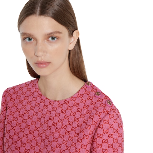 Los abrigos, las chaquetas y los vestidos de la colección Pre-Fall 2025 combinan una elegancia sutil con detalles refinados. Este mono de rizo de algodón con GG ofrece una sofisticación inconfundible que se potencia con unos botones de Doble G dorados.