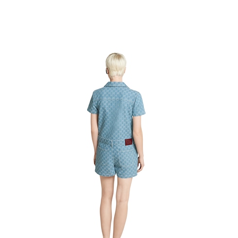 La colección Pre-Fall 2025 presenta los clásicos motivos de la Firma sobre texturas sofisticadas, desde el informal tejido denim hasta la ligera lona y el refinado ante. El jacquard de denim con GG vuelve para realzar este atemporal mono con unos botones Gucci esmaltados en el mismo tono.