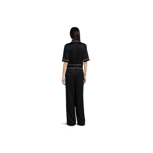 Una paleta monocromática con detalles sutiles, como bordados o apliques con logotipo, facilita la transición del día a la noche en una selección de prendas de la colección Pre-Fall 2025. Este mono de manga corta se ha confeccionado en satén con GG negro con un ribete blanco.