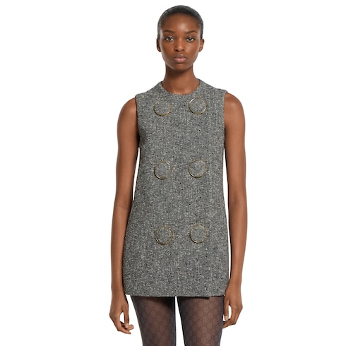 La confección de sastre define este vestido sin mangas de la colección Otoño Invierno 2025. Este modelo de cuello redondo inspirado en los chalecos largos cuenta con botones extragrandes forrados en la parte delantera.