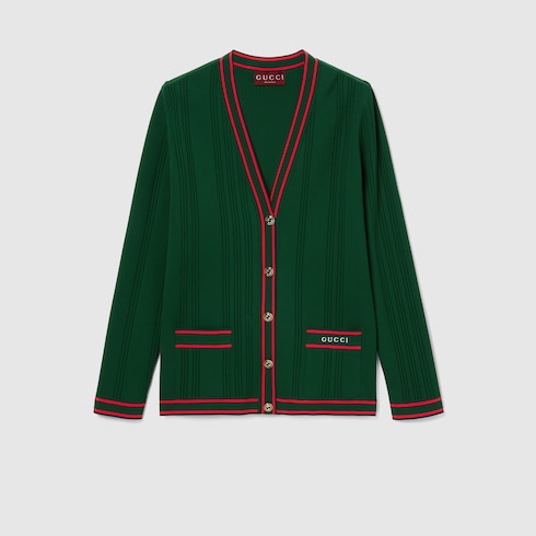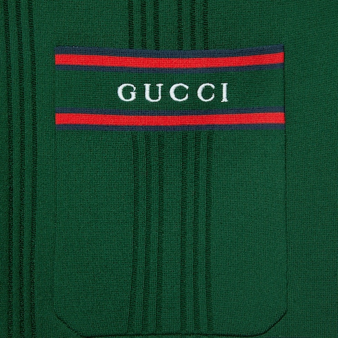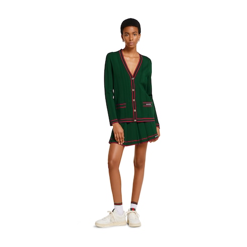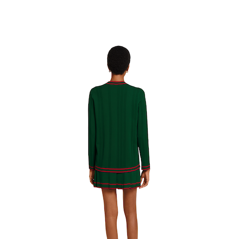 La Firma continúa explorando su conexión con el mundo del tenis, que comenzó en la década de 1970. Las exclusivas prendas se centran en elementos clásicos como la tribanda Web, así como en materiales innovadores. Este cárdigan de viscosa fina se realza con un ribete rojo a rayas en contraste y un bordado Gucci.