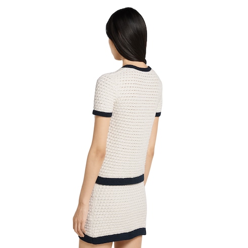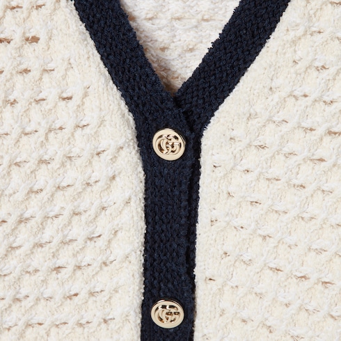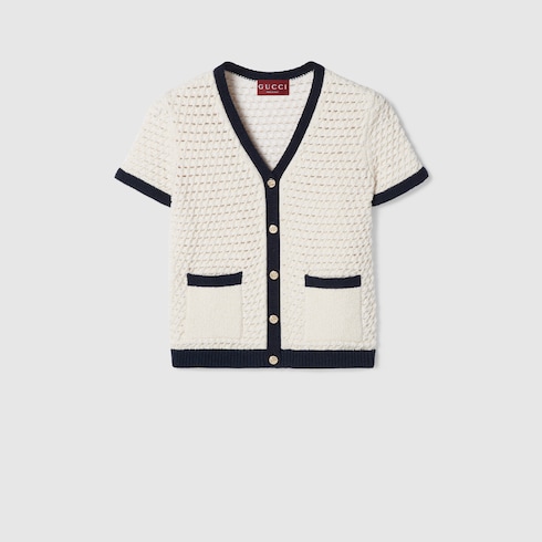 Los elementos marítimos distintivos, perfectos para disfrutar en la costa, decoran diseños informales de la colección Pre-Fall 2025 con rayas, ribetes en contraste y motivos exclusivos. Esta parte de arriba de croché fino se define con un sofisticado ribete azul marino en contraste y botones de Doble G dorados para llamar la atención esta nueva temporada.