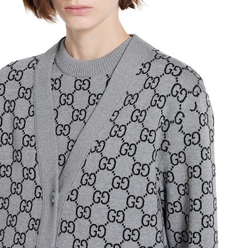 El motivo GG se reinventa en colores inesperados y combinaciones de tejidos, como la mezcla de lino o el nylon. Este cárdigan reversible con cuello en V se ha confeccionado en jacquard de lana fina con GG y exhibe una paleta de colores inversa en el reverso.