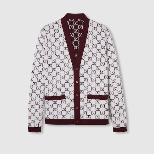 El motivo GG se reinventa en colores inesperados y combinaciones de tejidos, como la mezcla de lino o el nylon. Este cárdigan reversible con cuello en V se ha confeccionado en jacquard de lana fina con GG y exhibe una paleta de colores inversa en el reverso.