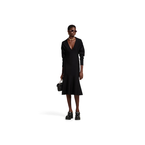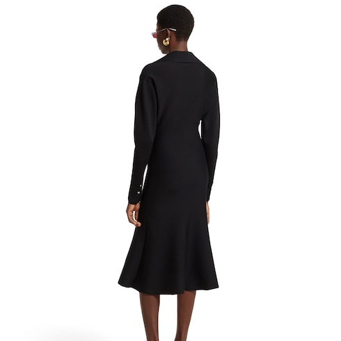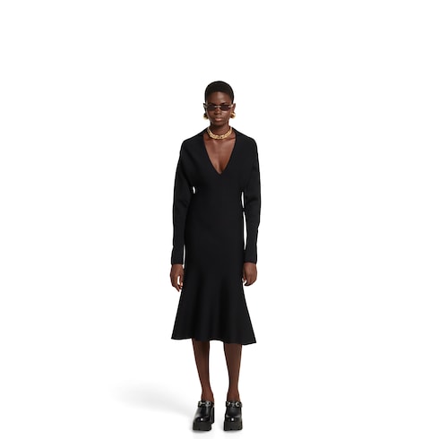 La colección Pre-Fall 2025 introduce una nueva versión de los materiales cálidos en prendas de punto sofisticadas, con siluetas tradicionales y contemporáneas. Este vestido ceñido se ha confeccionado en lana extrafina con botones de Doble G dorados.