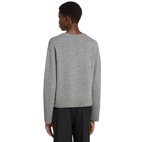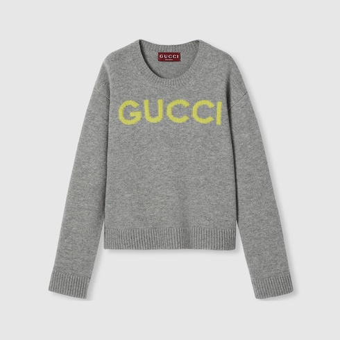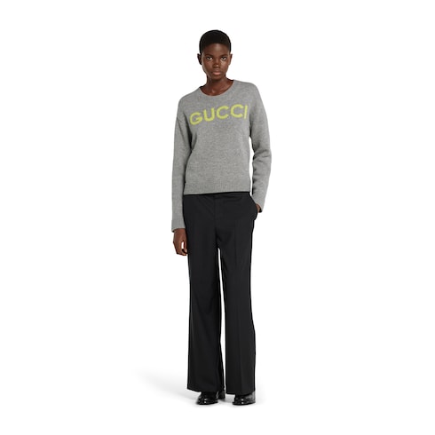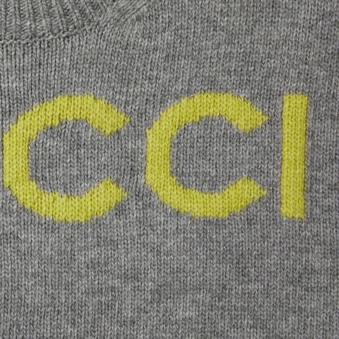 El logotipo Gucci se reinventa en colores inesperados y combinaciones de tejidos, como la mezcla de lino o la lana. Este top de cuello redondo está confeccionado en lana gris y se realza con una intarsia con la inscripción "Gucci".