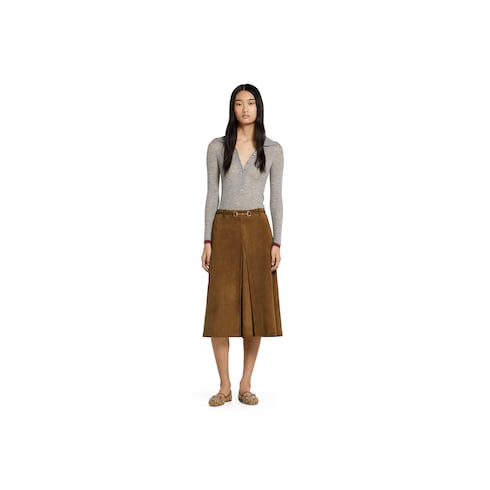 La colección Pre-Fall 2025 presenta los clásicos motivos de la Firma sobre texturas sofisticadas, desde el informal tejido denim hasta la ligera lona y el refinado ante. Esta falda corta de ante con un cinturón de piel con Horsebit se inspira en los años 70.