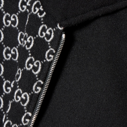La colección combina inspiración clásica y el lujo de los años 90 con siluetas elegantes y ceñidas para el día y la noche con hombreras estructuradas y marcadas. Esta chaqueta bomber se ha confeccionado en lana de seda negra con un motivo GG en el interior.