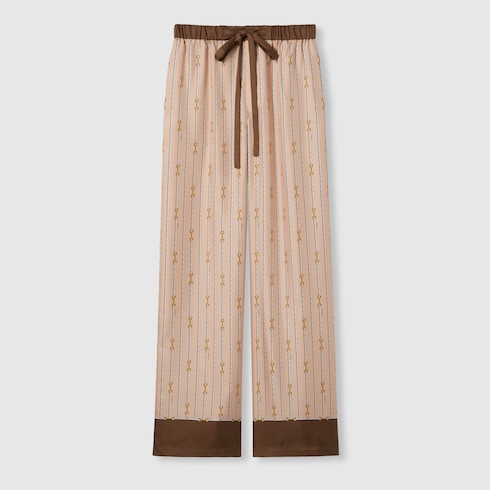 Los colores intensos y los motivos vistosos de la colección Pre-Fall 2025 aportan un toque llamativo a las prendas ready-to-wear de entretiempo. Este pantalón de sarga de seda se caracteriza por el estampado Gucci integral de cinturones y Horsebit.