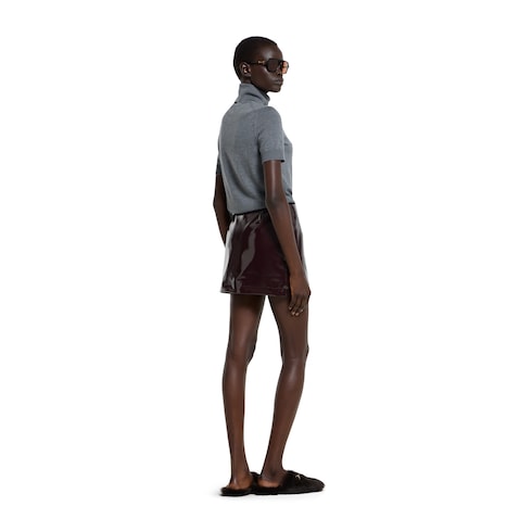 La colección juega con los contrastes de texturas mates y brillantes para crear efectos visuales exclusivos que destacan la artesanía de los diseños. Esta minifalda se ha confeccionado en tejido impermeable burdeos oscuro.