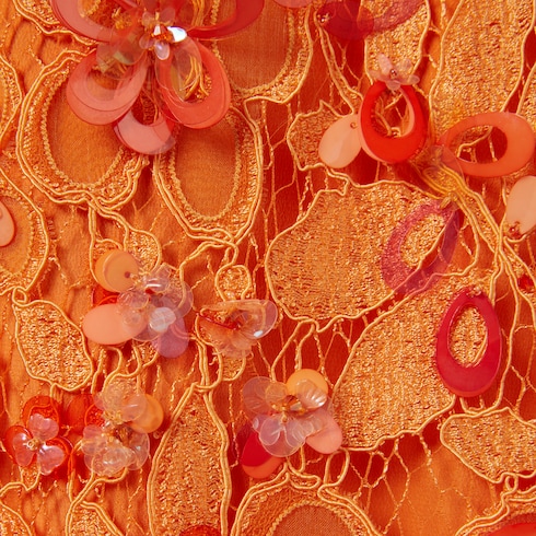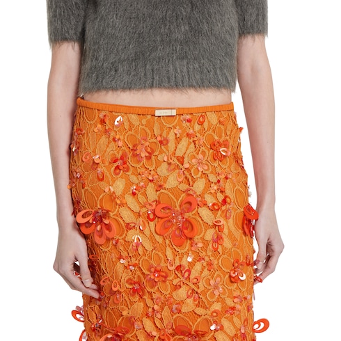 Esta falda de la colección Otoño Invierno 2025 se realza con motivos bordados y una cintura elástica fruncida con hebilla Gucci de metal. El modelo se completa con un forro extraíble, una abertura posterior y un cierre de cremallera.