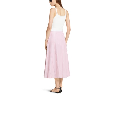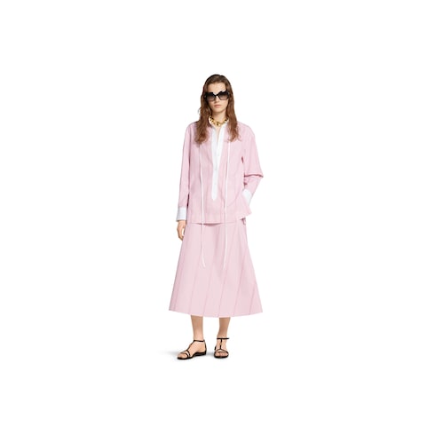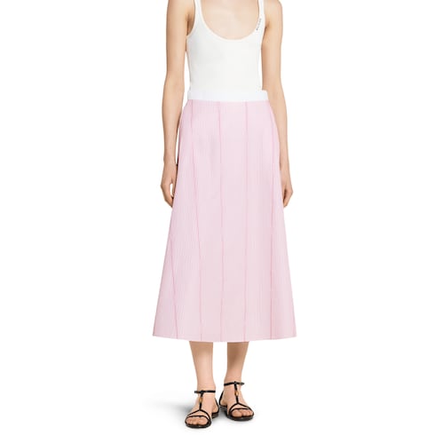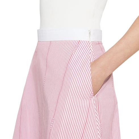 Los elementos marítimos, perfectos para disfrutar en la costa, decoran diseños informales de la colección Pre-Fall 2025 con rayas y motivos distintivos. El logotipo Gucci aparece como un sutil detalle en el fil coupé de algodón a rayas que define esta falda midi.