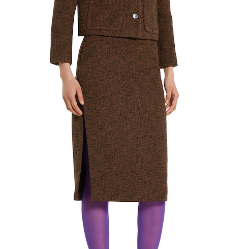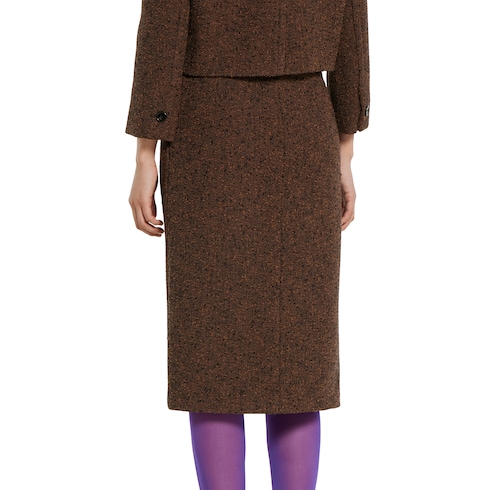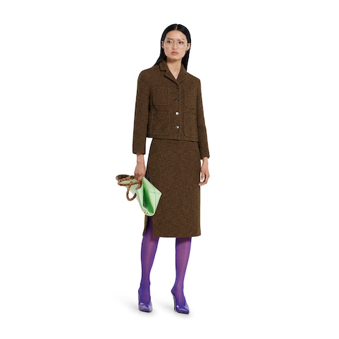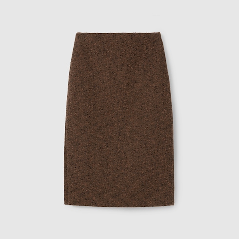 Esta falda de la colección Otoño Invierno 2025 se completa con un detalle de logotipo Gucci de metal en la parte delantera. El diseño completamente forrado cuenta con una abertura posterior y un cierre de cremallera.