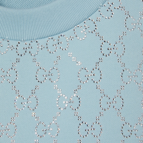 La colección Pre-Fall 2025 combina a la perfección texturas versátiles y detalles sofisticados. Los estampados y los bordados detallados evolucionan para reflejar el cambio de temporada. Esta sudadera de punto de algodón se realza con GG con cristales por toda la superficie.