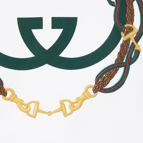 La colección ready-to-wear para mujer Cruise 2026 rinde homenaje a la estética de Gucci al combinar la influencia clásica con la historia de Florencia en un divertido acabado mezcla de diferentes intensidades. Esta sudadera de punto de algodón cepillado se realza con un estampado de GG entrelazada y un bordado de estribos.