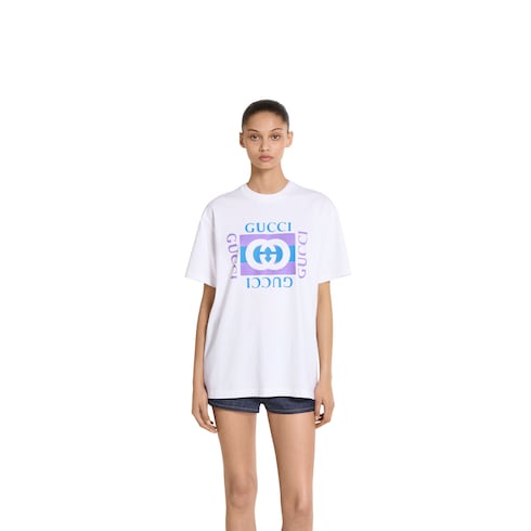 Los diseños para el día a día de la colección Pre-Fall 2025 se realzan con estampados o bordados informales. Esta camiseta se realza con un estampado de logotipo Gucci vintage.