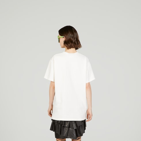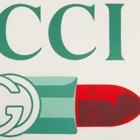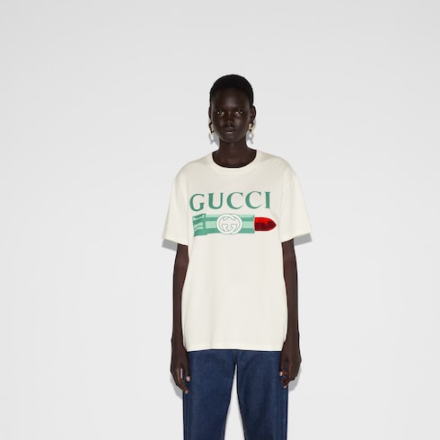 Los estampados divertidos y coloridos definen las colecciones ready-to-wear, como el motivo de barra de labios Gucci de esta camiseta de punto de algodón blanca. El estilo presenta un ajuste extragrande de cuello redondo.