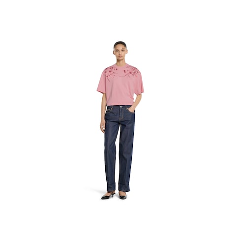 Los diseños para el día a día de la colección Pre-Fall 2025 se realzan con estampados o bordados informales. Esta camiseta de punto de algodón suave exhibe un estampado floral Gucci en la parte delantera de los hombros.