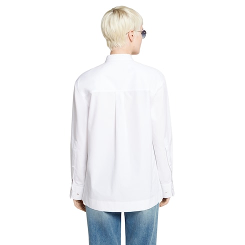 Una paleta monocromática con detalles sutiles, como bordados o apliques con logotipo, facilita la transición del día a la noche en una selección de prendas de la colección Pre-Fall 2025. Esta camisa de popelina de algodón exhibe un cuello recto con un delicado lazo anudable y un bordado de Doble G en la tapeta delantera.